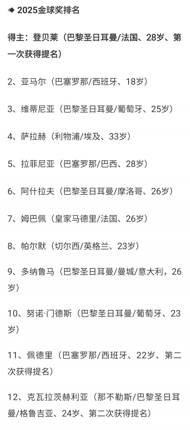 骆明表示:恭喜登贝莱获得金球奖。不过我的选票还不能公布,因为《法国古代足球 》杂志今年特地要求,具体选票不能先于他们公布。我只能暗示一下,苏超直播我的选票前五与最后前五(下图)人选一致,有三人顺序也一样,只有两个人顺序差了一位。您大概可以猜到我的选票了。