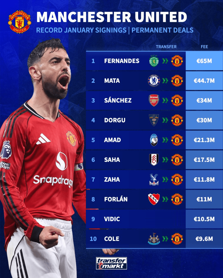 曼联冬窗最贵引援TOP10: B费居首, 桑切斯、弗兰在列