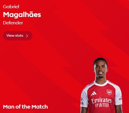 攻防俱佳,顶球制胜!官方:加布里埃尔当选2-1纽卡全场最佳球员