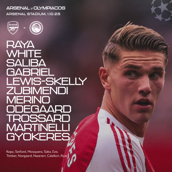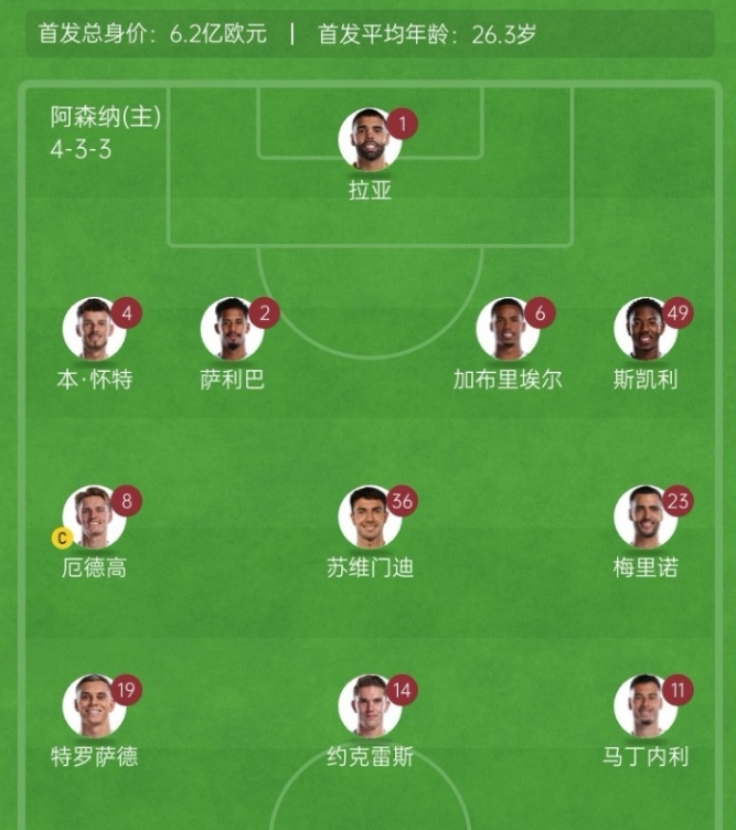 阿森纳vs奥林匹亚科斯杆位:1-拉亚、2-萨利巴、4-本·怀特、6-加布里埃尔、49-斯凯利、8-厄德高、36-苏维门迪、23-梅里诺、11-马丁内利、19-特罗萨德、14-约克雷斯