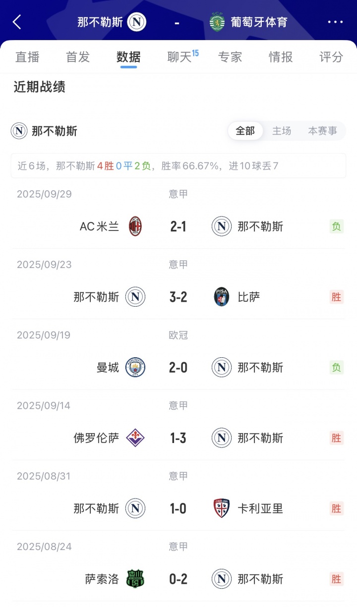那不勒斯上一轮欧冠,0-2不敌曼城;葡萄牙体育上一轮欧冠,4-1战胜阿拉木图凯拉特!
