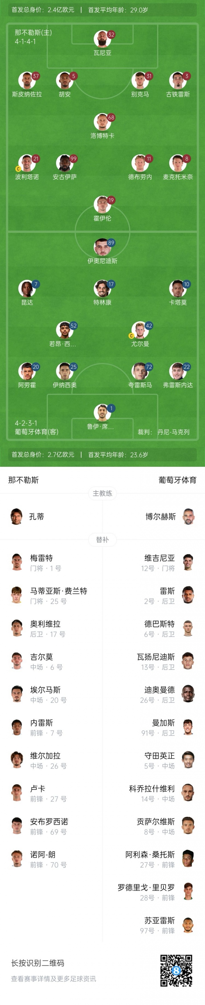 那不勒斯vs葡萄牙体育杆位:麦克托米奈搭档德布劳内,霍伊伦出战