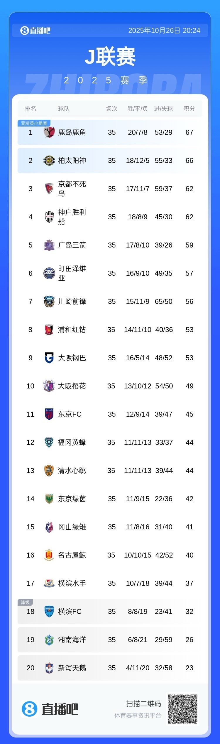 10月26日讯 J1职业联赛 第35轮,湘南海洋客场应战 0-1不敌福冈黄蜂,提前3轮确定降级,时隔8年再度回到J2职业联赛 。