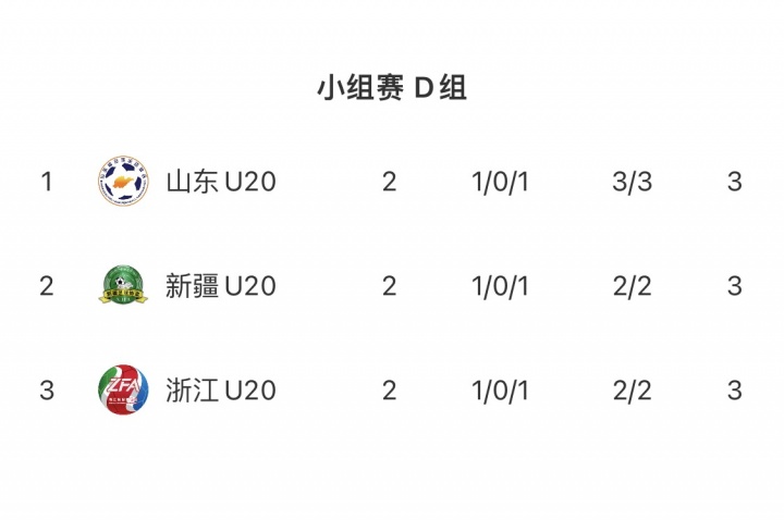 昨日男足U20的D组末轮较量结束后,山东、浙江、新疆三队同积3分,山东U20队凭借得分 数优势(3球)率先出线。